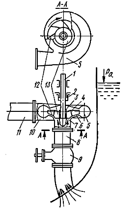 В отводе и дуффузоре скорость потока снижается и часть кинетической энергии жидкости преобразуется в потенциальную энергию давления. У центра колеса образуется область пониженного давления, поэтому жидкость из трубопровода 8 поступает через подвод 7 к рабочему колесу. При постоянной частоте вращения рабочего колеса жидкость в подводе и диффузоре движется с постоянной скоростью, а непрерывный выход жидкости из колеса обеспечивает устойчивый процесс всасывания.