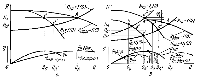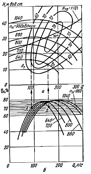 Теоретическое построение кривой H = f (Q) затруднительно вследствие невозможности достаточно точного учета гидравлических потерь. Действительная характеристика с достаточной точностью может быть построена только на основании результатов испытаний.