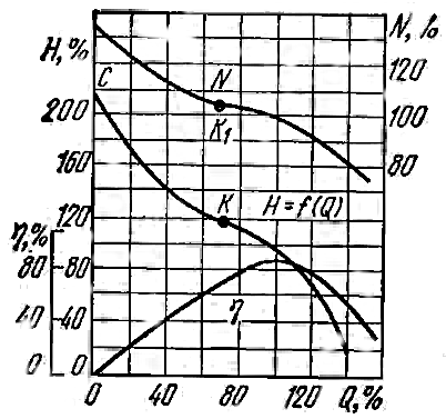 Действительные характеристики обычно имеют точки перегиба K1 и K. Это объясняется тем, что при уменьшении подачи, а вместе с ней и осевой скорости, начинает увеличиваться напор, создаваемый лопастями насоса. Это увеличение напора распределяется неравномерно по длине лопасти: концевые элементы развивают больший напор, чем элементы корневых сечений. Нарушается равенство осевых скоростей: у корневых сечений скорости уменьшаются, а к периферии растут, что вызывает за колесом паразитное перетекание жидкости от периферии к центру. Это является причиной повышенных потерь и усиленного вихревого движения жидкости в межлопастных каналах, и при Q = (0,4 ÷ 0,5) Qнорм работа насоса весьма неустойчива.
