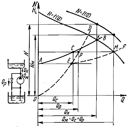 В режимах, расположенных левее точки M, насос не может работать устойчиво. Пусть режим работы насоса отклонится от режима, характеризуемого точкой D, в сторону болыших подач (точка E). При этом потребный напор HE потр меньше напора HE, сообщаемого жидкости насосом. Этот избыток энергии идет на приращение кинетической энергии. При этом скорость жидкости увеличивается до тех пор, пока расход не достигнет значения, соответствующего режимной точке C. При отклонении режима, характеризуемого точкой D, в сторону меньших подач потребный напор болыше напора, развиваемого насосом. Недостаток энергии в жидкости приведет к ее замедлению и, следовательно, к падению подачи до нуля или к возникновению отрицательной подачи.
