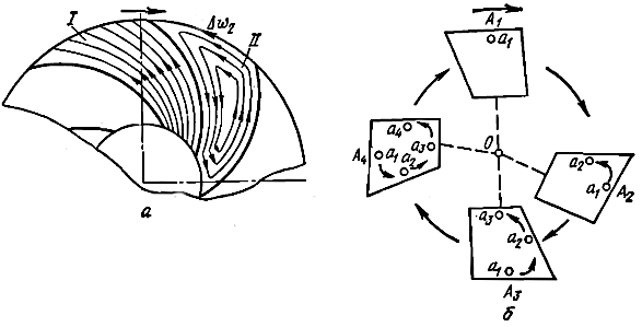 Если заполненный жидкостью сосуд А в форме межлопаточного пространства (рис. 6, б) вращать относительно оси O, то можно отметить частицу жидкости а в верхней части сосуда. При повороте сосуда из положения А1 в положения А2, А3, А4 частицы жидкости, связанные со стенками сосуда лишь незначительными силами трения, будут стремиться сохранить свое верхнее положение в сосуде и отмеченная частица займет соот- ветственно положения a1, a2, a3, a4. Частица a будет двигаться относительно стенок сосуда при его вращении по замкнутой траектории a1, a2, a3, a4.