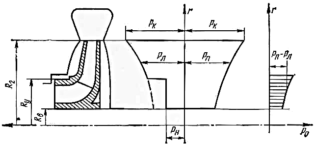 При вращении рабочего колеса в насосе, заполненном жидкостью, возникает разность давлений по обе стороны каждой лопасти, т. е. происходит силовое взаимодействие потока с колесом. Преодолевая возникающий момент, колесо преобразует механическую энергию двигателя в энергию перекачиваемой жидкости, отчего ее давление и скорость при выходе из колеса по сравнению с этими параметрами при входе в колесо увеличиваются.