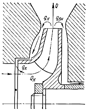 Выходящая из колеса жидкость в количестве Qк поступает в отвод и напорный патрубок насоса в меньшем количестве Q, так как часть qк возвращается в подвод через затвор в уплотнении между колесом и корпусом, а часть qвн уходит из насоса через сальник. У многоступенчатых насосов жидкость может перетекать из последующих ступеней в предыдущие.