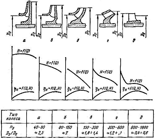 Эти насосы имеют коэффициент быстроходности ns > 500 и характеризуются малым отношением диаметров D2/D0 (см. рис. 19). Жидкость в их рабочем колесе движется в осевом направлении, поэтому насосы называют осевыми, а так как в потоке отсутствует радиальное перемещение частиц и исключена работа центробежных сил, у осевых насосов напоры меньше, а подачи больше, чем у центробежных насосов.