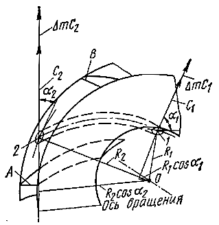 Пусть частицы жидкости с массой Δm за время Δt поступают со скоростями C1 в воображаемую элементарную струйку тока 1-2, выделенную в канале между лопастями A и B рабочего колеса (рис. 4).