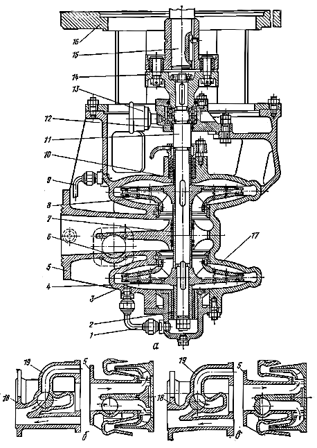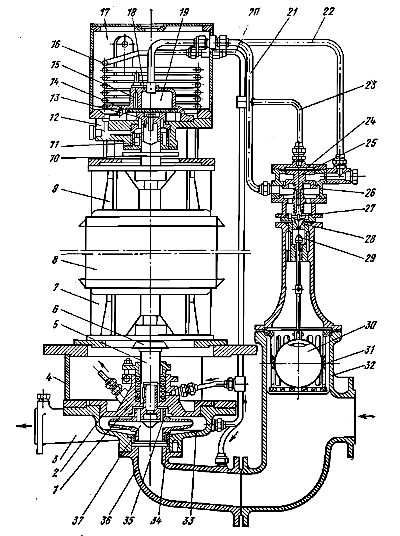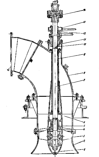 Верхний конец вала 7 жесткой муфтой 14 соединяется с промежуочным валом, имеющим опору с радиально-упорным подшипником, воспринимающим массу ротора и осевую силу. Промежуточный вал соединяется с валом электродвигателя. В насосах Оп с большой подачей лопасти соединяются с втулкой подвижно, а механизм поворота лопастей установлен внутри втулки.