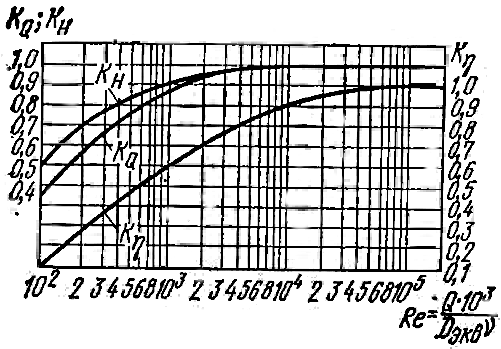 - KQ, KH, Kη – коэффициенты для пересчета, которые можно принять по кривым графика рис. 25 в зависимости от числа Рейнольдса Re.