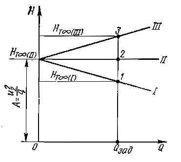 На рис. 8 показаны теоретические характеристики (I, II, III) насосов с бесконечным числом лопастей при одинаковой частоте вращения колеса и одинаковых размерах рабочего колеса, но с различными углами β2:β2 < 90°, β2 = 90° и β2 > 90°.